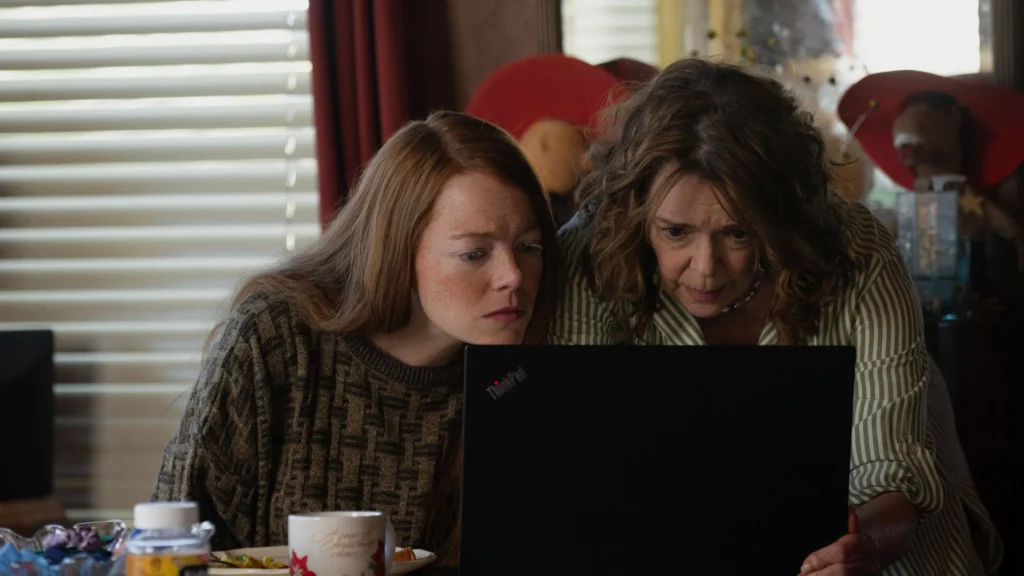 A família é considerada — principalmente por uma ótica religiosa — uma instituição basilar da sociedade ocidental. Os grupos de interesse mais conservadores a instrumentalizam para defender suas pautas políticas e justificar os problemas sociais argumentando que há uma verdadeira conspiração com o plano de destruí-las, o que é uma grande bobagem. Intrigante como em Eddington existe uma disfuncionalidade causada pelo adoecimento mental de alguns indivíduos, que, por sua vez, é causado pela relação parassocial com a internet, mas não pela desconstrução dos símbolos clássicos religiosos familiares, mas pelo próprio caráter conspiratório da defesa dos costumes e das instituições. Ted Garcia é um pai de origem hispânica — outra ascendência muito presente no Novo México — que foi abandonado pela esposa, mas que, apesar de essa grande questão estar presente no ar, vive uma relação muito saudável com seu filho Eric (Matt Gomez Hidaka) o que contrasta com Joe Cross que, apesar de lunático, está camadas abaixo de sua sogra Dawn (Deirdre O’Connell) e sua esposa traumatizada Louise (Emma Stone), e tenta alcançar o nível de loucura delas para ser amado novamente. Joaquin Phoenix é um ator fantástico, principalmente trabalhando com James Gray e Paul Thomas Anderson, mas que nos últimos anos interpretou personagens muito parecidos ao que fez em Coringa. Joe Cross, apesar de carregar uma insegurança latente e um certo nível de loucura, nunca se torna um coitado. Seus atos vis, mesmo movidos pelo emocional, são executados de forma racional e premeditada. É a grande atuação do filme, mas poderia destacar também as próprias Stone e O’Connell, além do Austin Butler que faz muito em pouco tempo de tela.