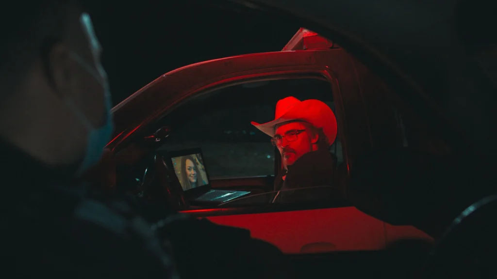 Eddington tem a narrativa abruptamente alterada em duas partes a partir de uma festa, com aglomeração e perturbação da ordem. O que estava no campo do discurso de fato toma contornos de violência, explodindo as tensões sociais de um país em chamas. Mas é curioso que, enquanto na primeira parte se valorizava a paisagem clássica do faroeste solar, a segunda parte é total escuridão. Não há mais clareza nas intenções de quem tem uma arma na mão. Não há mais aparências. Há visceralidade. Sangue, carne, tripas. Mas o celular continua cumprindo o seu papel de criar narrativas. Um detalhe que pode passar despercebido é o empresariado tecnológico, que no início da corrida eleitoral apoia um candidato, mas quando a maré vira, o seu apoio se mostra volátil. Uma candidatura pode até flertar com a radicalidade, mas a prática política se rende ao capital. E o progresso tecnológico é inevitável. A terra continua a ser profanada por aqueles que vieram depois.